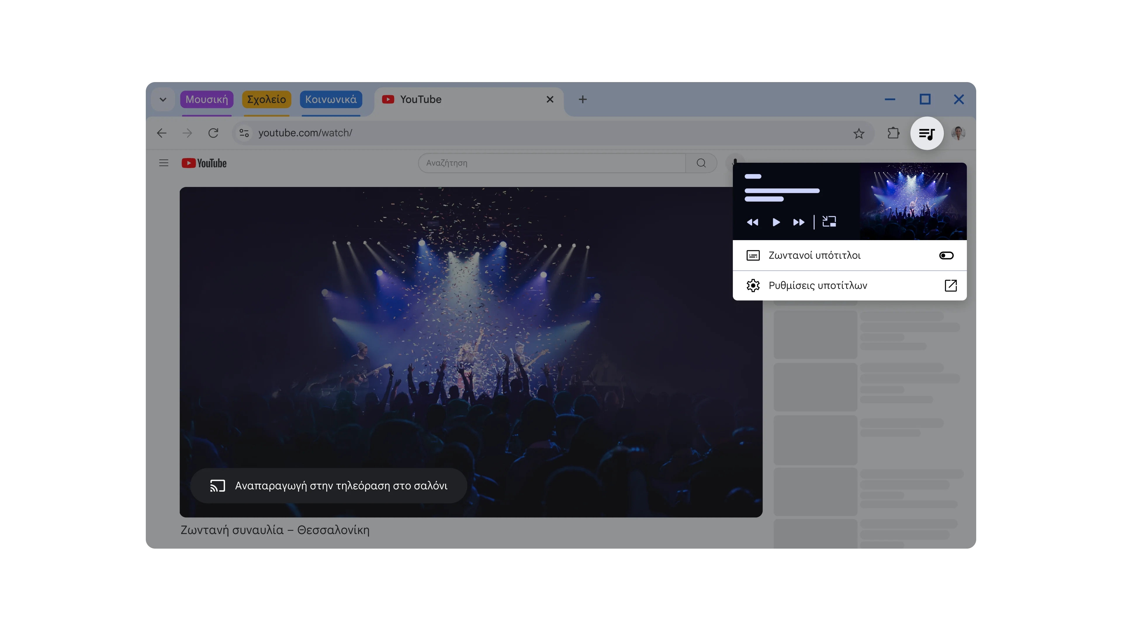 Με το Chrome, μπορείτε να μεταδίδετε περιεχόμενο από τον υπολογιστή ή το τηλέφωνό σας σε μια τηλεόραση με ενσωματωμένο Google Cast. Επιλέξτε τη μετάδοση ολόκληρης της οθόνης ή μόνο μιας συγκεκριμένης καρτέλας.